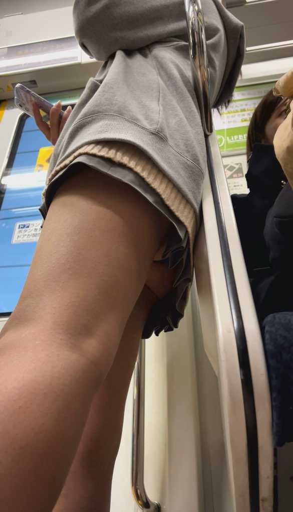 電車内のドアの横で寄りかかっているところを超ローアングルで撮影開始。何回か体勢を変えたところずっと撮影してます。
