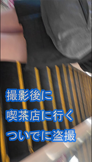 撮影後にビル内にある喫茶店で軽食を取ることに。最初はエスカレーターからの逆さ撮り。先に行くように指示してスカート内を狙います。エスカレーターから出た瞬間気づかれそうになり、かなり焦りました。途中衣類コーナーに寄り道し、その間もスカート内を狙い逆さ撮り。周囲に店員やお客も居て見つからないように撮影。