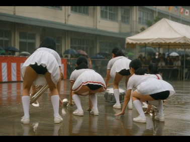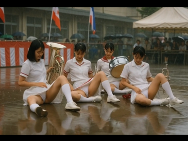2組目の4人も、大雨の中、頑張って演奏しています。白のアンスコを惜しげもなく見せてくれます。また、スカートから垂れる雨水の様子も分かります。