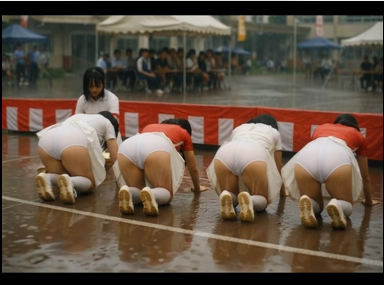 最初の4人は、雨の中、ハイキックをしたり、後ろを向いて白いアンスコを見せたりしています。途中、ブルマの部分もあります。雨のため、シャツが透けている場面もあります。そして、胸のポチが分かるところもあります。