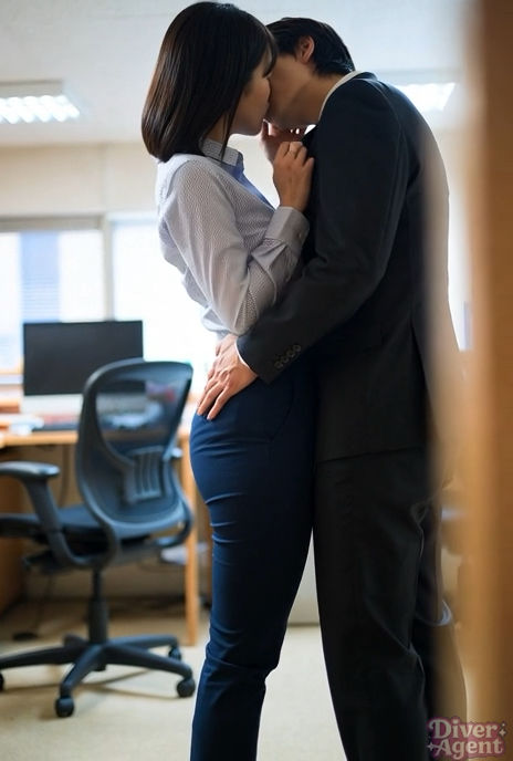 スカートをたくし上げてパンツを太ももまで下ろした彼女の生尻を前から抱き寄せるように揉む男性。突然背後に人影が現れ、慌てて離れ、服の乱れを直す彼女。
