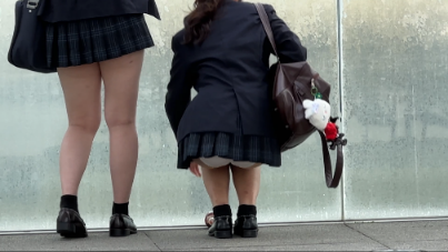 2人を女友達と二人で追跡。女友達と居れば怪しまれないんですよね~。もう少しかがめば見えるパンツにカメラを向ける。女友達と二人で遠距離写撃。