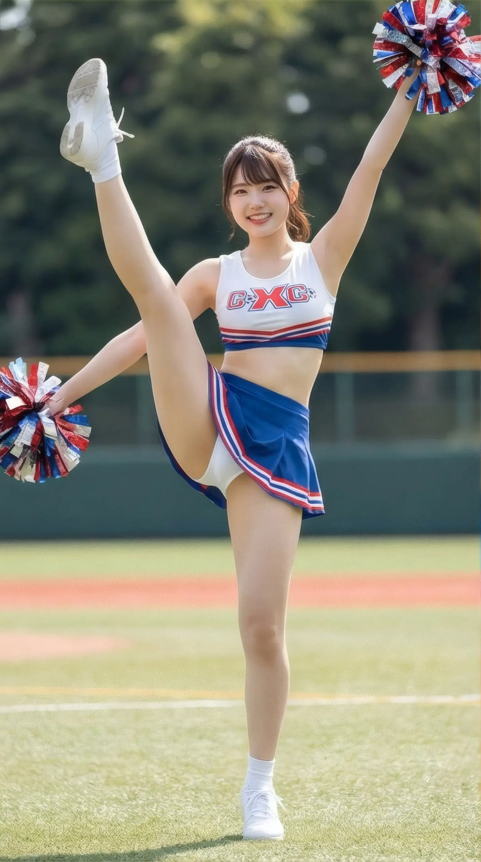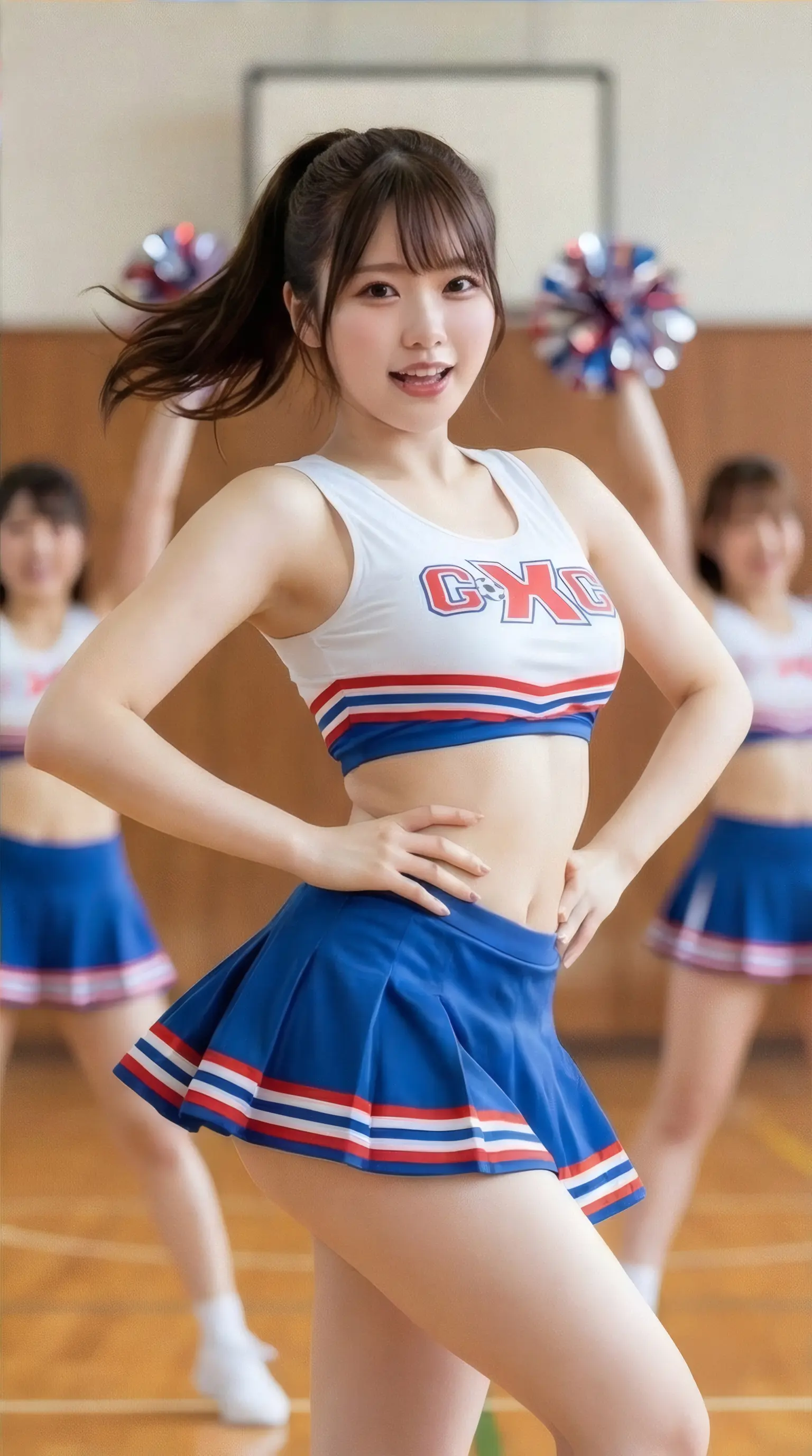 先ず体育館で、チアガール衣装に合わせた赤白青のトリコロールのポンポンを両手に軽快に動き、ステップを踏みジャンプ、少し歩み寄った後は軽快なダンス。その後は本編のお楽しみ開始(^^;;。ローアングルで股間をズームしたり、ハイキックする股間へズーム。