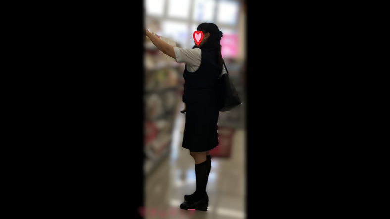 一緒に長時間しゃがみ込んで商品を選んでいましたが、立ち上がった隙に逆さからもスカートの中を捉えています。