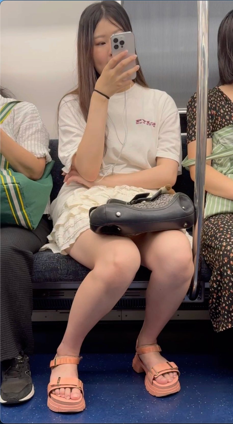 前半は足を閉じた状態でスマホを操作。後半は足を伸ばした状態になってくれたので、モデル並みに細い美脚を見れます。