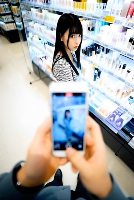 ブッ◯オフの店内でKがいたので撮影開始です。しばらく様子を見て、スカート内を覗きます。