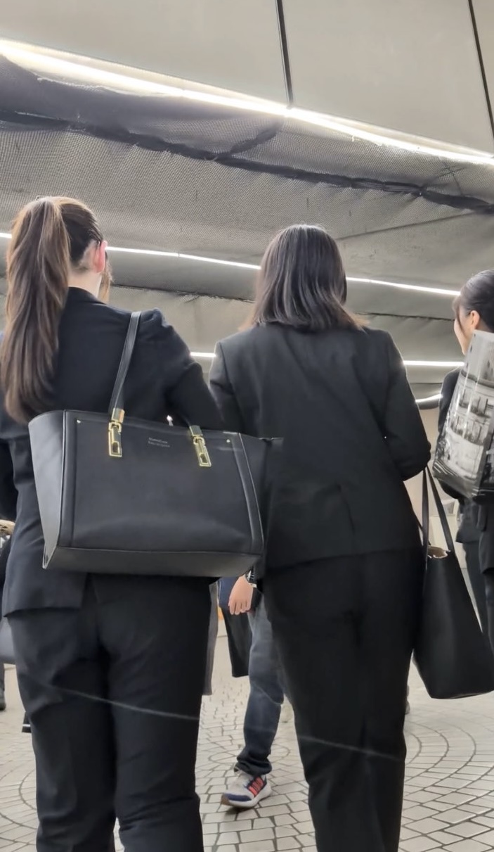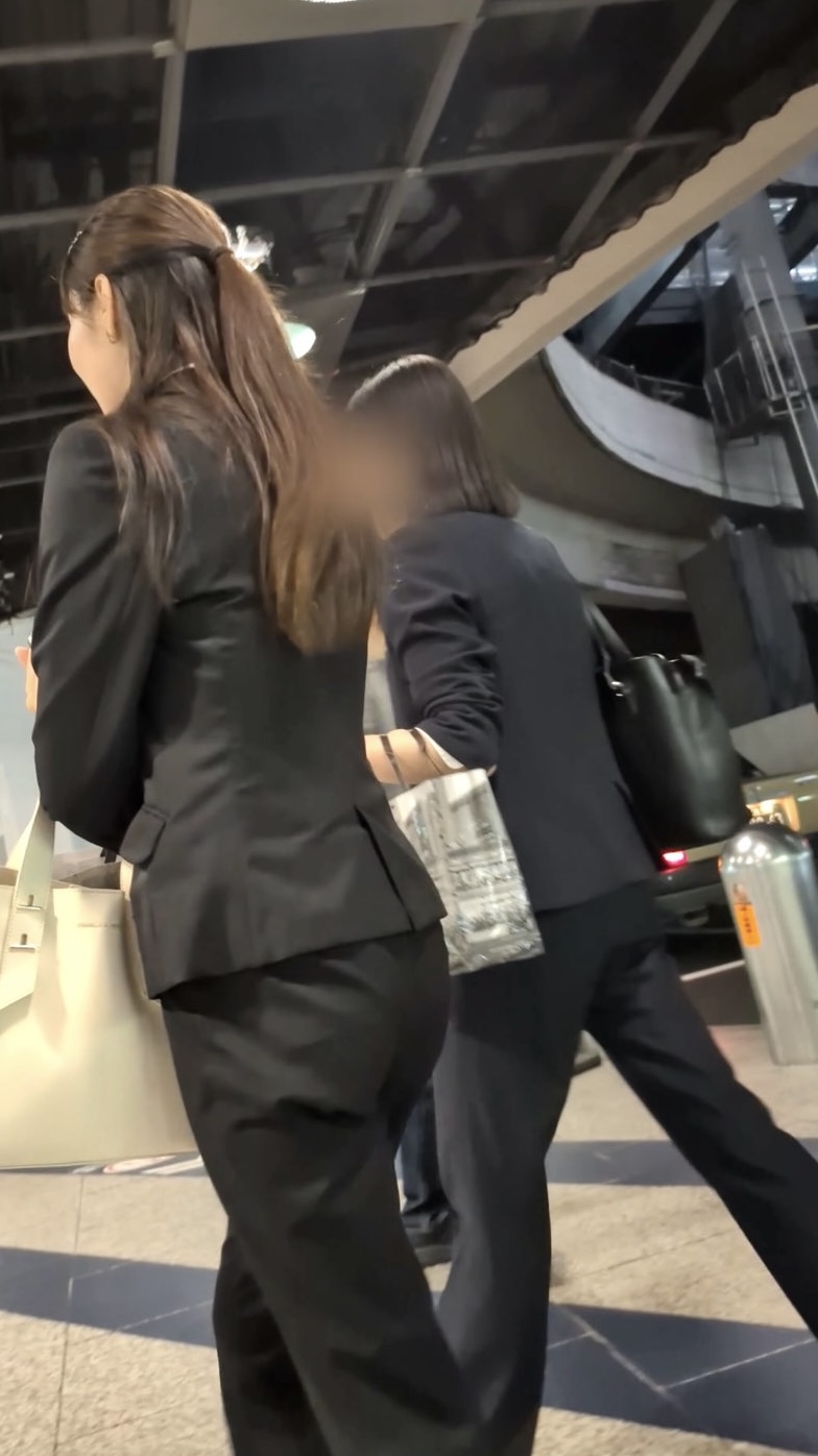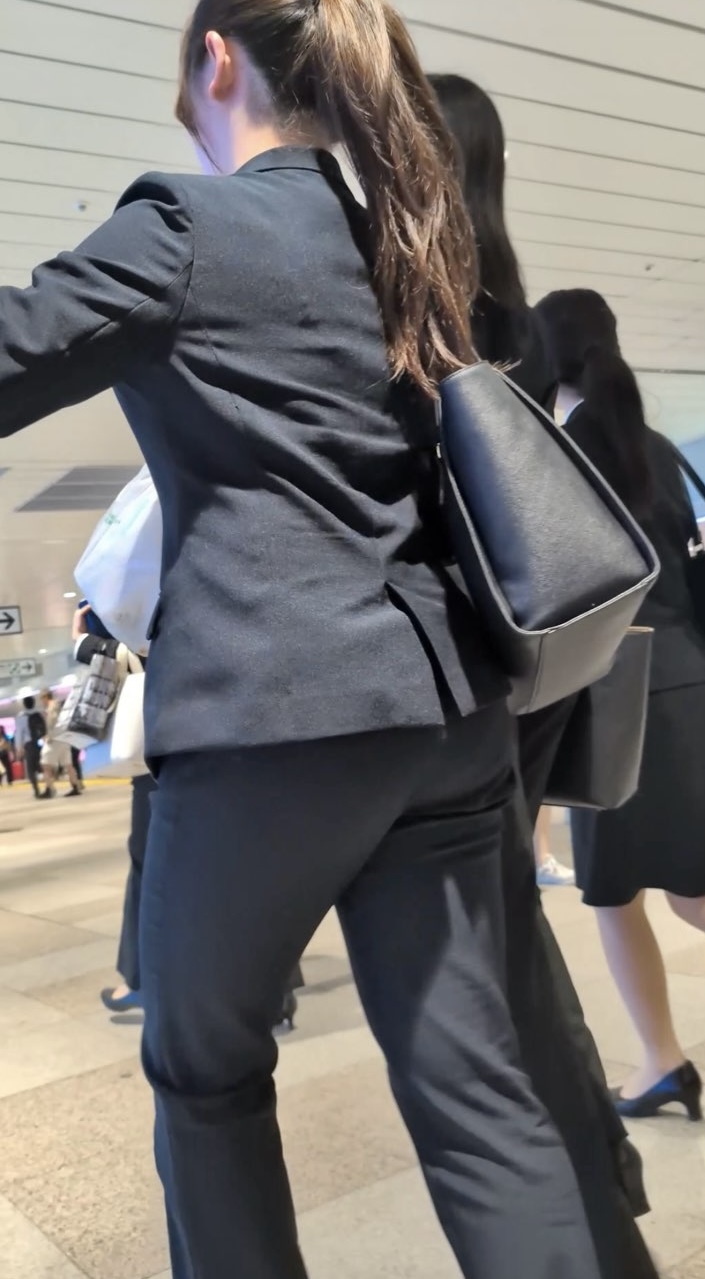 キャッキャしながら歩くその姿がなんとも魅力的。暗めの駅構内でもパンツのたまらない陰影が確認できます。後半の階段登りは近すぎてドアップになってしまったのはご愛嬌。フロントからの歩行ショットは壮観で、みなさんジャケットの内側からメスのフェロモンがバンバン出ています。スローモーションも乞うご期待です。