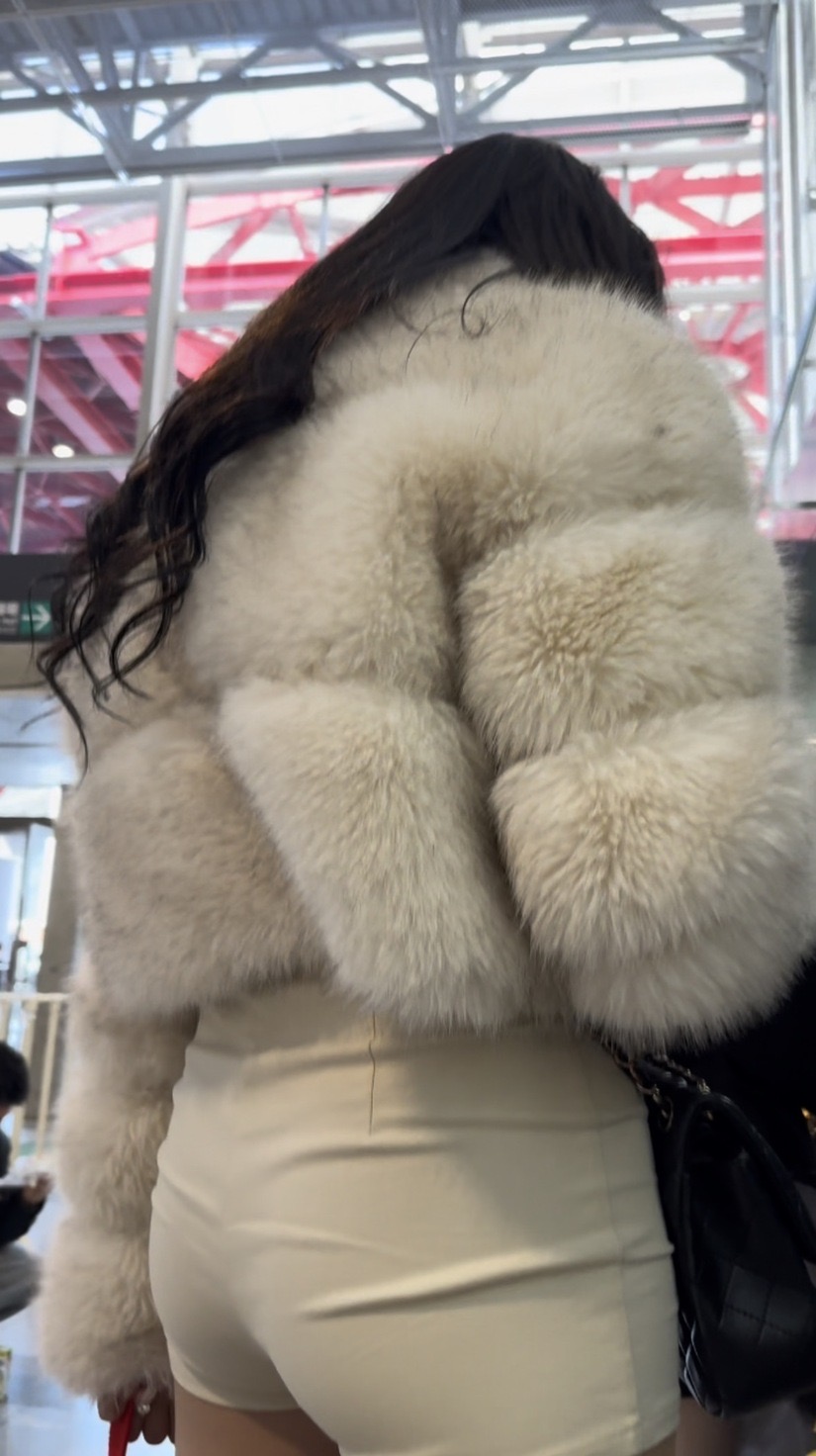 もこもこのアウターにニーハイブーツショートパンツのお姉さん