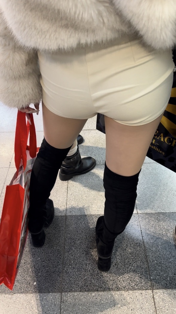お尻の形が丸わかりなピチピチのショートパンツと黒のニーハイブーツの組み合わせが最高