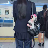 黒髪ロングヘア。紺ジャケットとスカートの制服女子