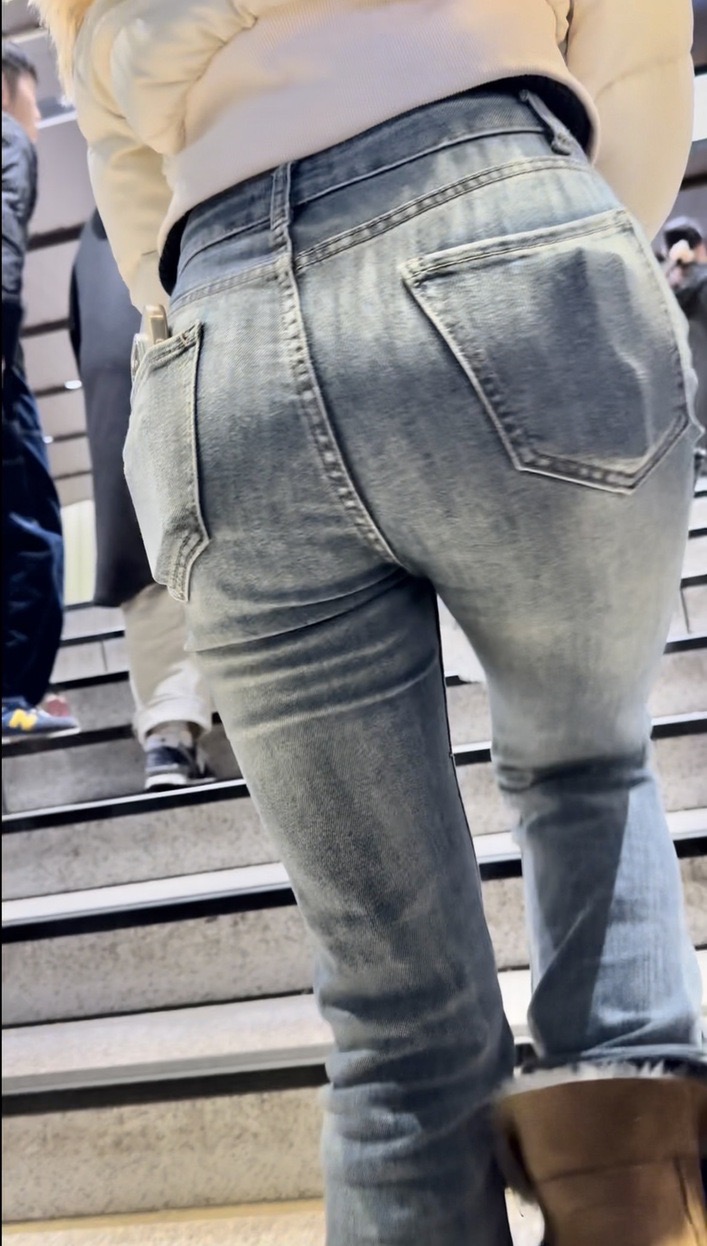 短丈の白のダウンにライトブルーのフレアデニムのお姉さん