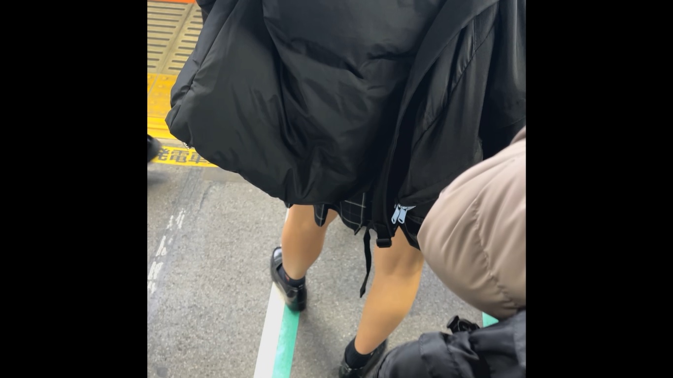 既に電車が到着し乗り込み寸前からのスタート。慌てて追いかけ一人挟んで後ろへと並ぶ。チェックスカートと生足ローファーを確認。