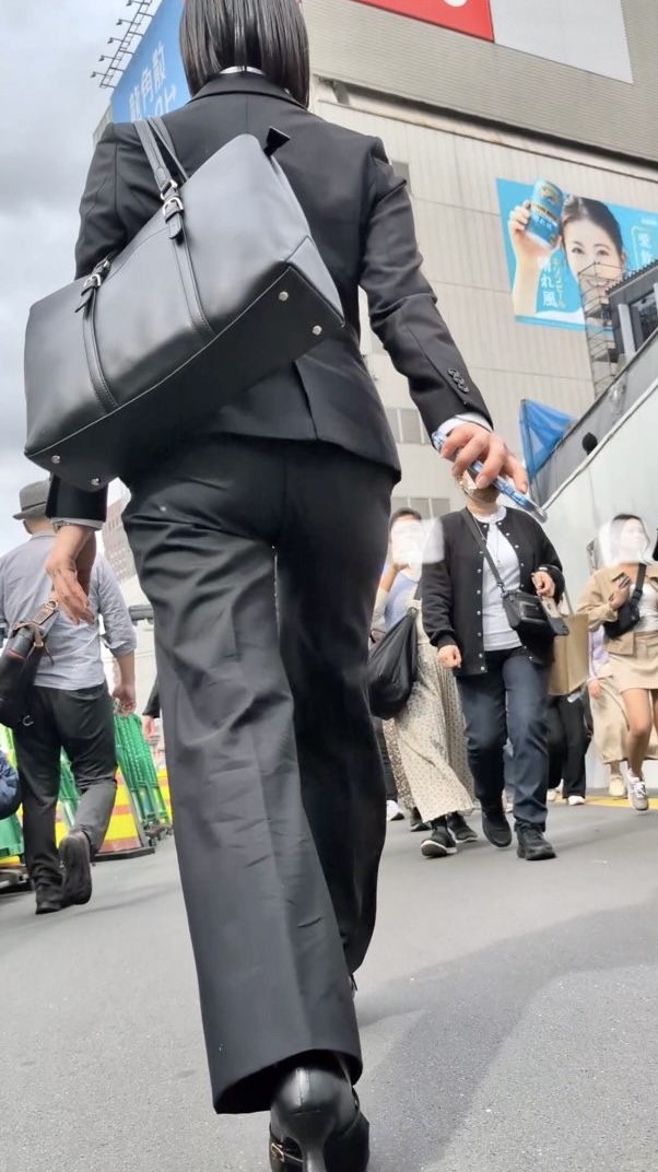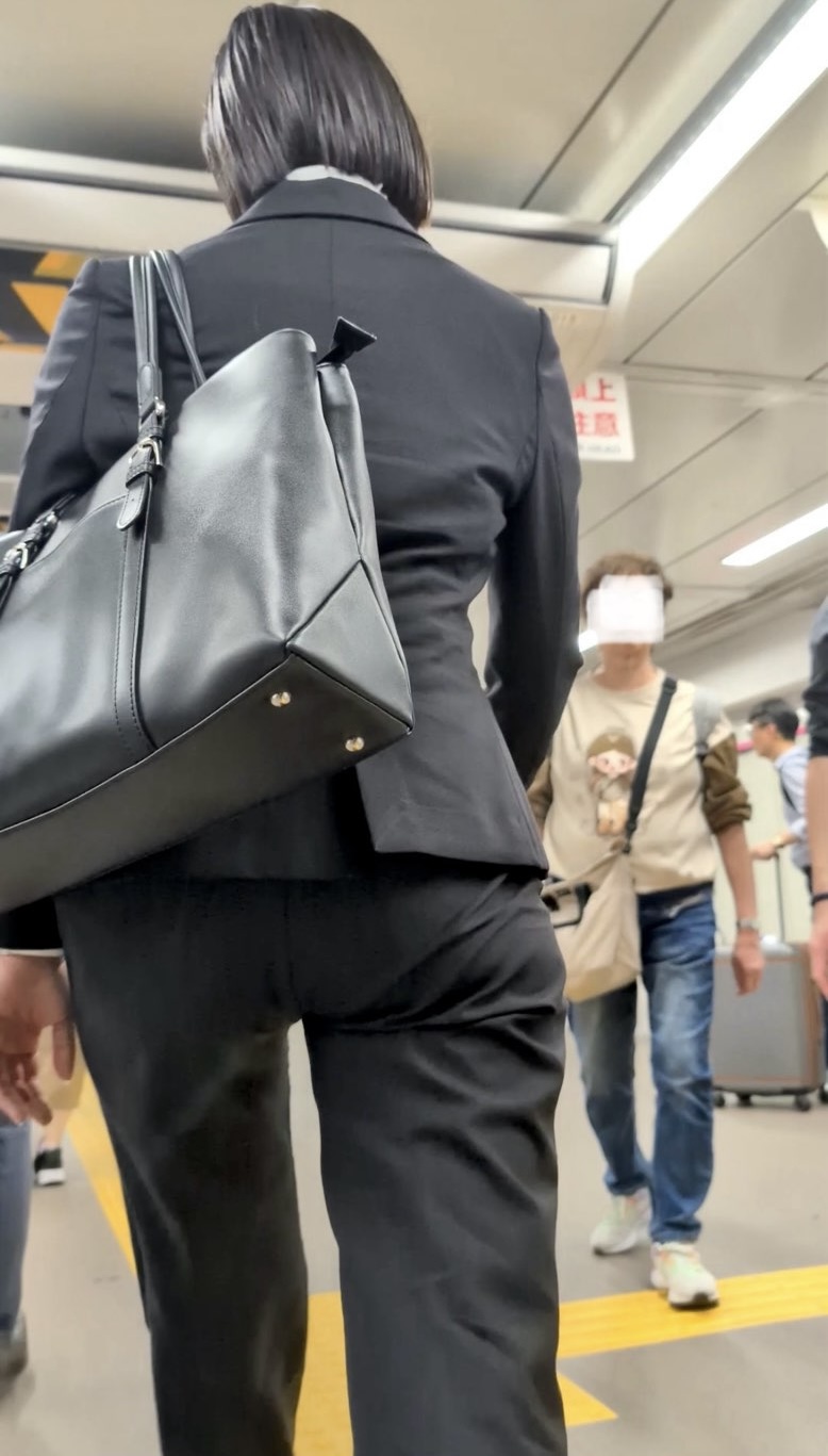 サラサラのショートボブの髪も美しく、スラッとしたスタイルの良さでスーツ姿が似合います。パンツは少しゆったりしたタイプながら、お尻周りはピッタリとタイトなのは流石わかっていらっしゃる!
