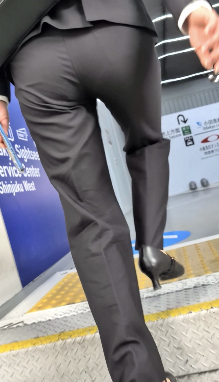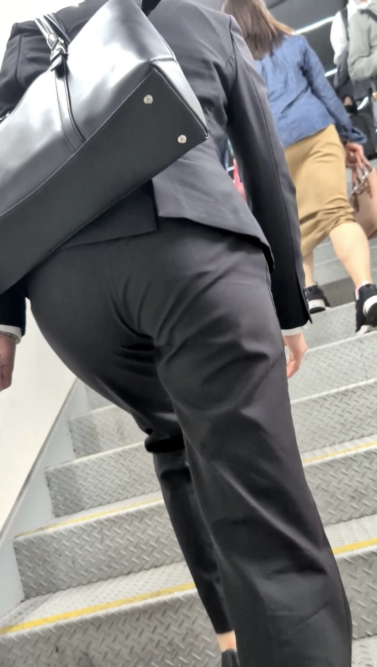 そんなピッタリなパンツがいきなりの階段登りで披露されます。見事なバックショットで、うっすらと内側のラインが透けております!さらに駅構内を歩いたり屋外へ移動したりとするなかで、ほぼピッタリ追尾!