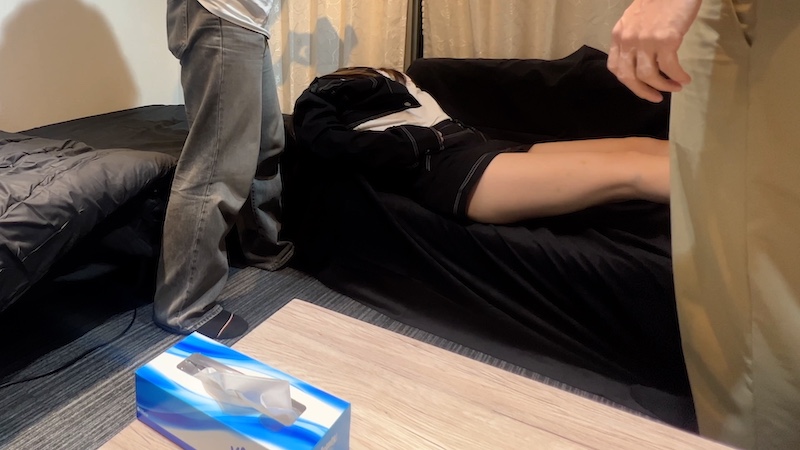 深夜の繁華街、地回りして30分ほどですかね。結構潰れている子が多かったんですが、どれでも状況的に難しくて... 二人で悩みながら歩いていた時に、路上の階段に座り込んでいる女を発見!足元にはストロング缶も置いてあるし、これはイケるだろってことでアタック→二人でアジトまで運び込み成功◎