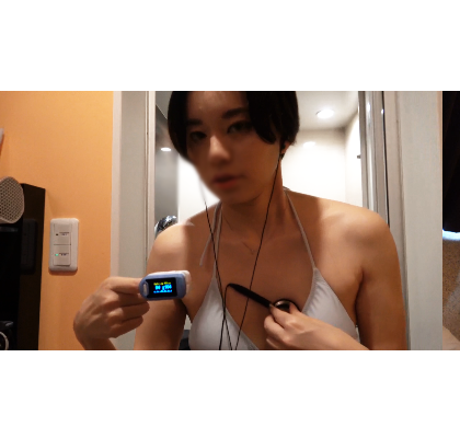 袋呼吸したときの心臓の音は、袋を被っていただきその中で呼吸をしていただいております。袋は心音1にある袋呼吸しながら運動したときのものよりも大きめのものを使っており、かんなさんの呼吸に合わせて袋が膨らんだりしぼんだりしております。しっかりと密閉されていますね。心臓の音もゆっくりですが途中22分12秒あたりで「ドックン、ドックドックン、ドックン」と期外収縮が出ておりました。この撮影の前にたくさんキツイ撮影をしておりましたので、心臓にもかなり負担がかかり出てしまったのでしょうか。