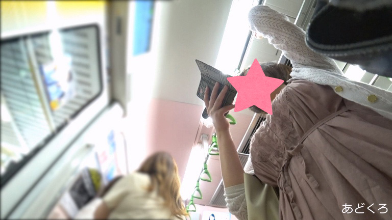 明らかに陰毛とわかるものが透けてしまい、丸見えになっています。電車内までついていく予定ではなかったのですが、これはもっと撮りたいと思い、一緒に乗車します。