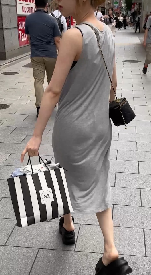 ペラペラ生地のワンピース姿でお出かけのお姉さん。