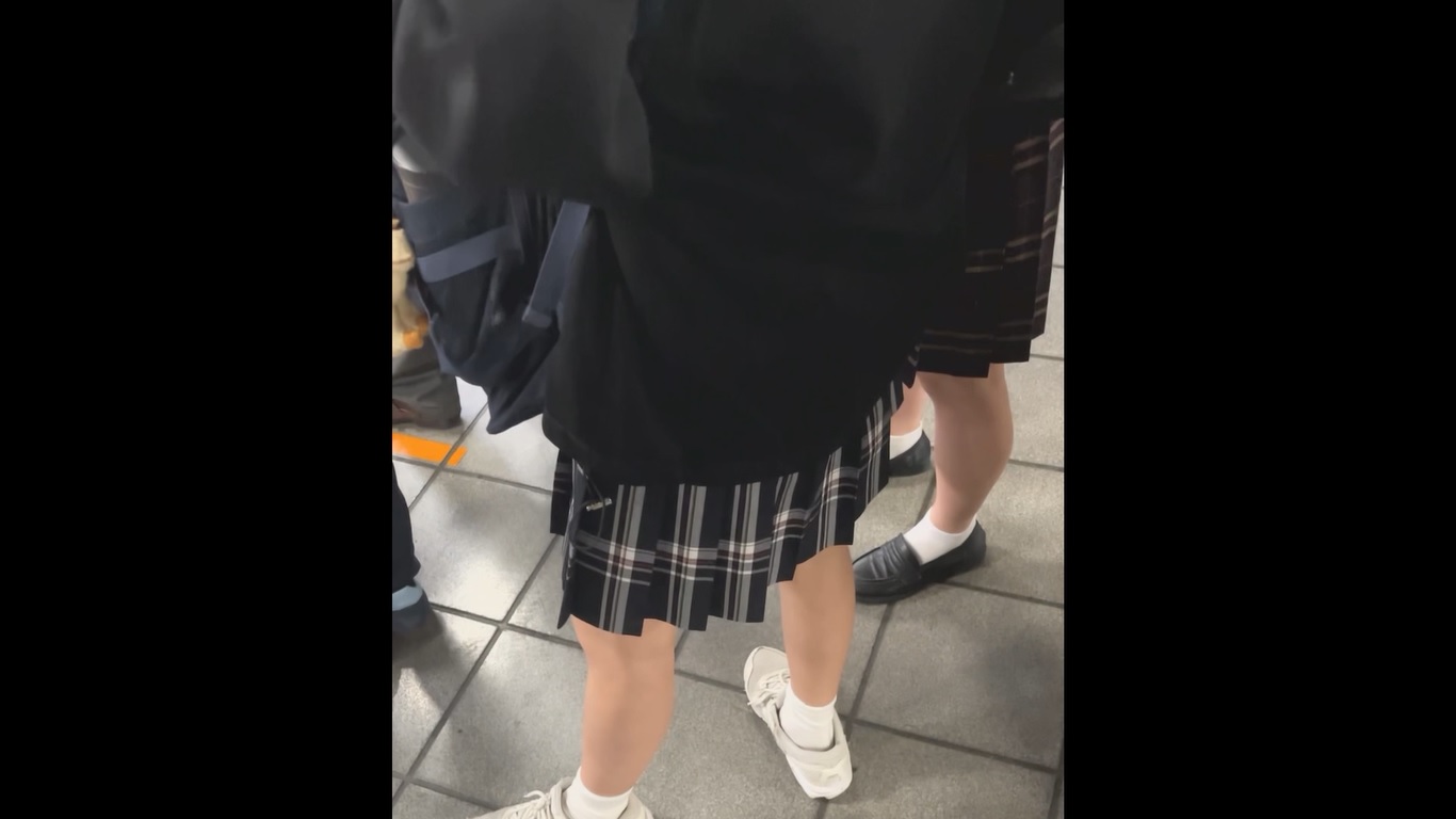 仲良く二人で電車待ちする女子を見つけてすぐに並びの列へ。会話に夢中で警戒心皆無で電車に乗り込みあっさりと真後ろをキープ。