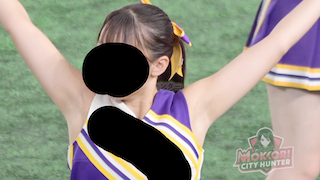 このシーンは主に練習シーンがメインです。本番前に動作を確認するのが目的。そのため靴紐を結びシーンやストレッチなど披露してくれてます!靴紐結ぶ時にしゃがんだのでアンスコばっちり見えてモッコリです!準備が終わると技の確認へ!ここではジャンプやタワーなどの大技の練習へ。ここで題名にあるとおりブラが見えるチアを確認!しかもタワーの上の役割なので美女です!紫衣装が特徴ですがブラはベージュと意外な組み合わせ!でもはっきり色もわかったり色々見えそうになったりとモッコリはここで最高潮です!練習からこれなので本番が待ち遠しい!ぜひお買い求めください!