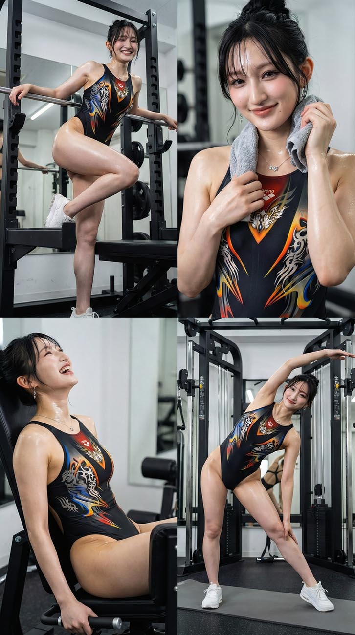 最新機器を取り揃えた現代的なトレーニングジムで、燃え上がるようなドラゴンの柄をあしらったar⚫︎na社製の黒の長ハイレグカットなカスタマイズ競泳水着。ゴリゴリの韓国系最新メソッドでモムチャン(最高の体)を追求した証明の鍛え上げられたボディ。