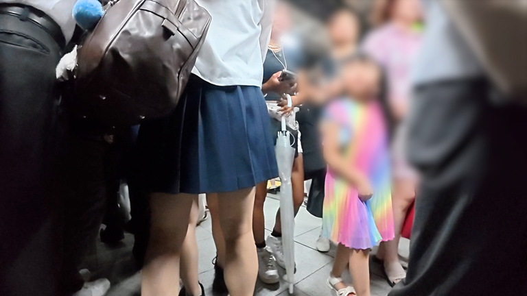 逃げるように降りるタゲを追跡し、階段前の混雑でさらにお尻を粘着お触り。